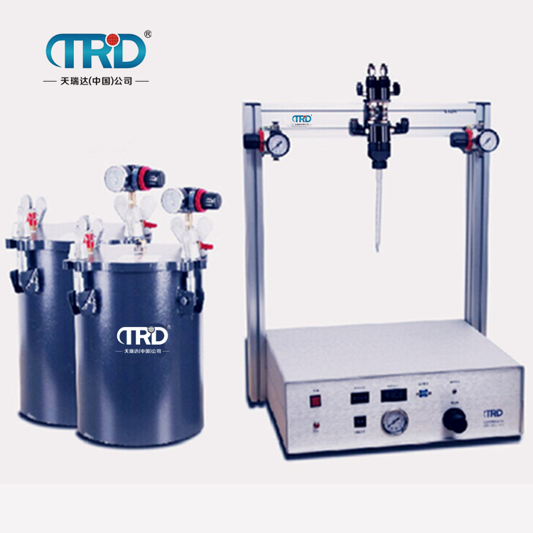 (1)簡易式灌膠機,組成比較簡單,兩個料桶,一個氣缸,通過氣體的壓力將膠壓出來混合,一般比例大致為1:1,主要應用于一些低端的,對灌膠工藝要求不是太嚴格的產品。