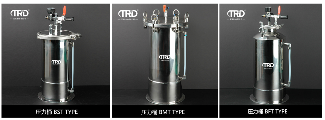 產品介紹BFT TYPE壓力桶專業用在大點膠量的場合,對保持點膠閥系統點膠的精確度非常重要。每個液料壓力桶都配有精密恒壓調壓閥,維持從壓力桶至點膠閥的流體壓力。液料壓力筒的開關是簡單的夾緊方式,結構上內部面和下部面相同,可以使用內部容器。使用時可將膠水原包裝直接放入桶內,用完無需清洗,維護方便